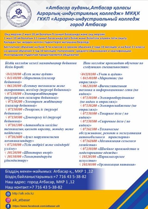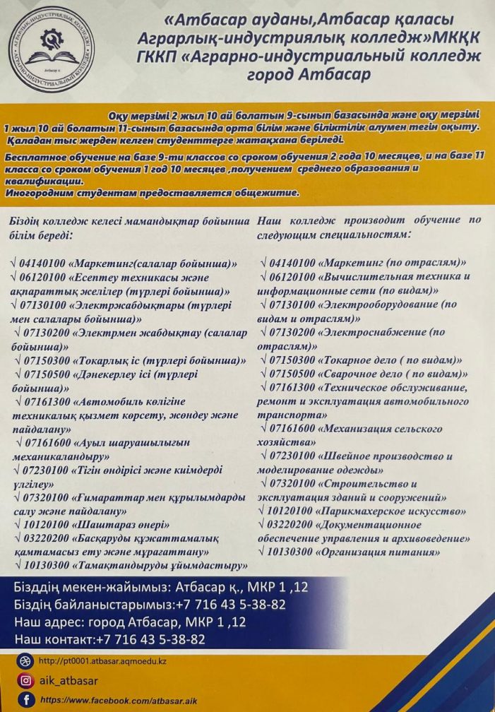 Государственное коммунальное казённое предприятие "Аграрно-индустриальный колледж, город Атбасар, Атбасарский район" при управлении образования Акмолинской области